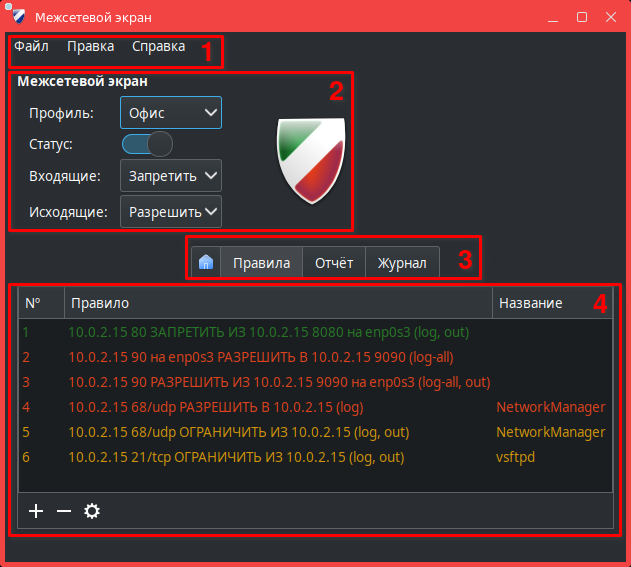 - 2 — основные элементы управления межсетевым экраном;