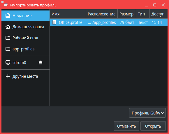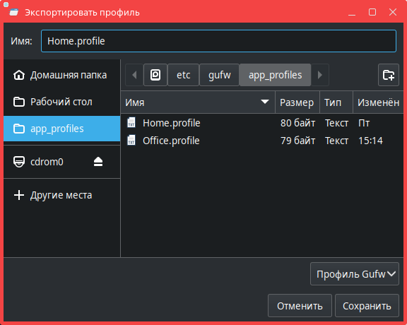 По умолчанию экспортированный профиль будет сохранен в каталог /etc/gufw/app_profiles/. Для сохранения профиля в другой каталог следует в диалоговом окне Экспортировать профиль самостоятельно задать необходимый каталог.