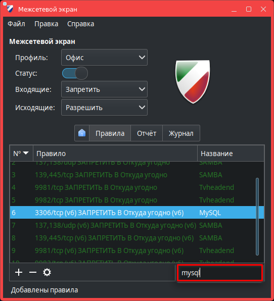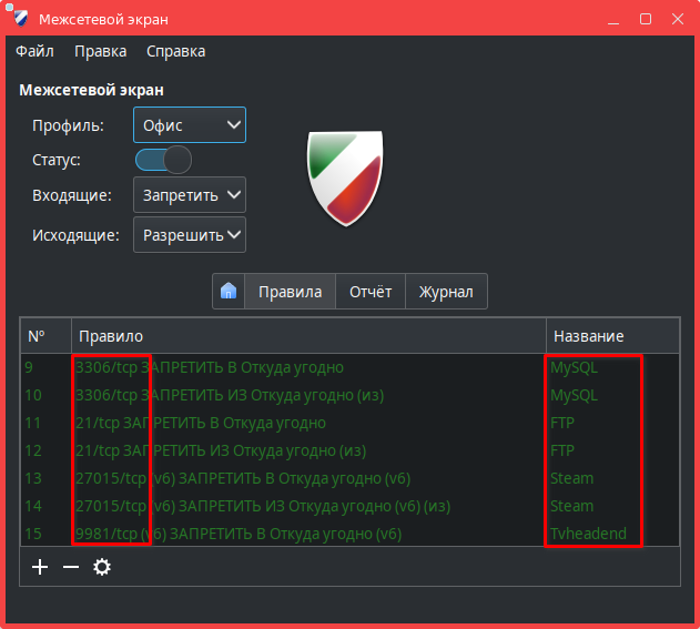 Управление службой межсетевого экрана ufw в графическом интерфейсе. Программа позволяет создавать правила обработки сетевого трафика, которые будут записаны и обработаны в iptables. Подробное описание возможностей программы см. man gufw.