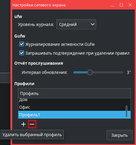 - в открывшемся окне Настройки сетевого экрана выбрать профиль и нажать [Удалить выбранный профиль].