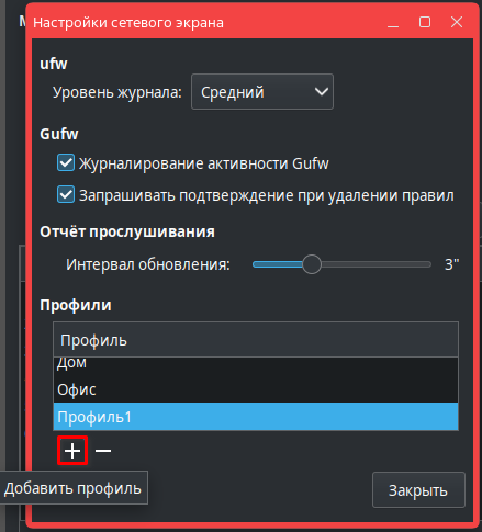 - в открывшемся окне Настройки сетевого экрана нажать [Добавить профиль].