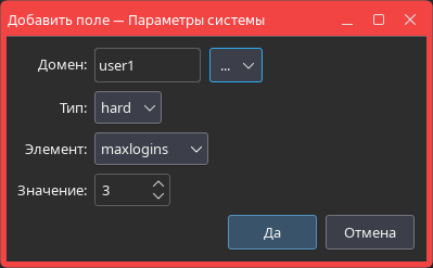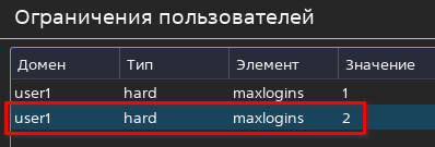 ВНИМАНИЕ! При наличии нескольких ограничений, отличающихся друг от друга значением выбранного элемента, применяется ограничение, находящееся ниже по списку. Например, если для элемента maxlogins задать значения, равные 1 и 2, то будет выполнено ограничение, находящееся ниже по списку (со значением, равным 2).