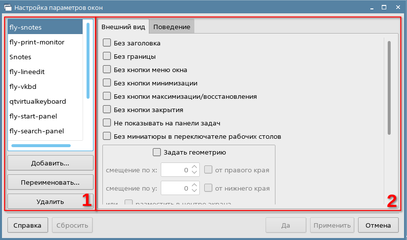 - Поведение — содержит настройки поведения окна (см. Настройка поведения окна).