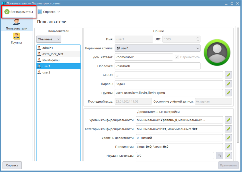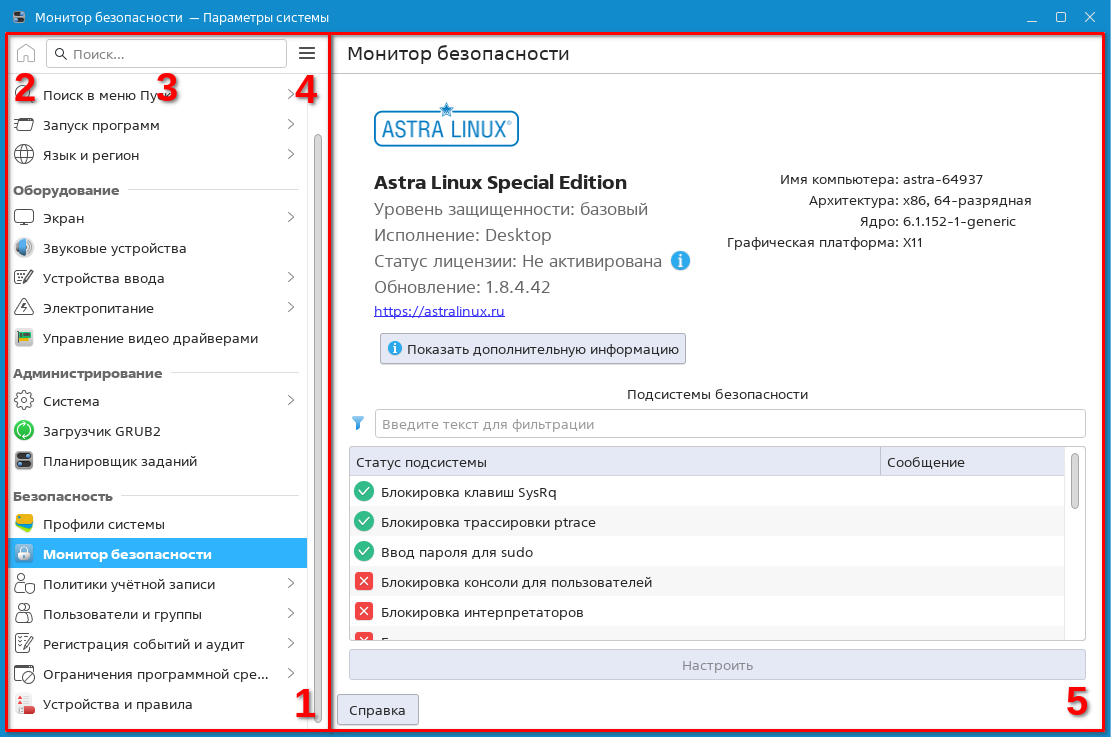 - краткую информацию о системе (наименование ОС, версия, уровень защищенности и другая информация). Для просмотра детальной информации о системе и оборудовании необходимо нажать [Показать дополнительную информацию] — будет запущена программа Информация о системе (см. справочную страницу «Информация о системе»);