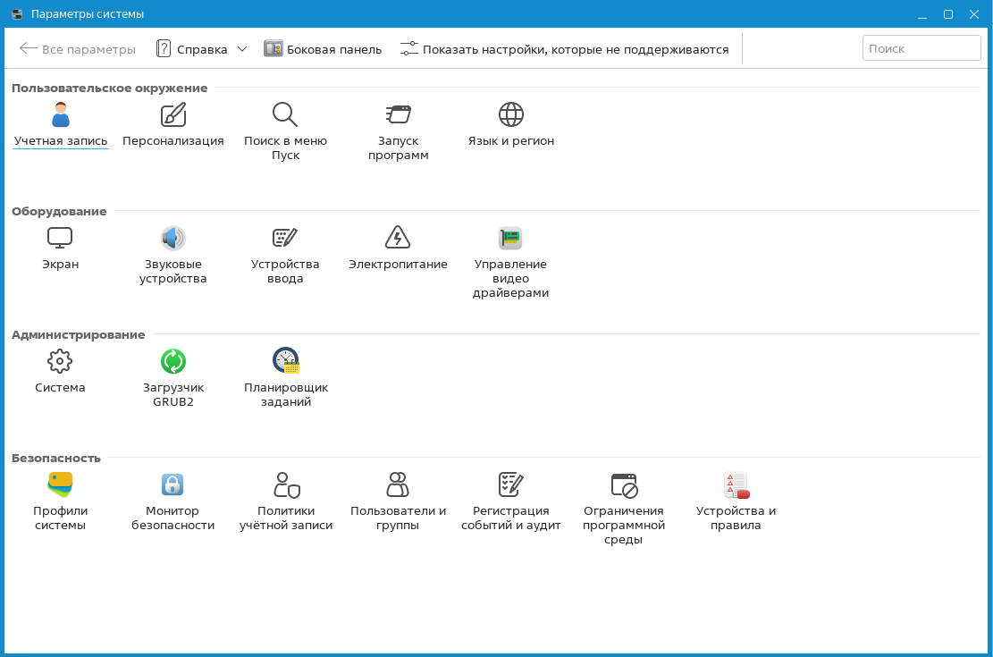 В режиме «Значки» окно программы содержит панель со значками разделов. Для поиска нужного раздела можно воспользоваться полем поиска.