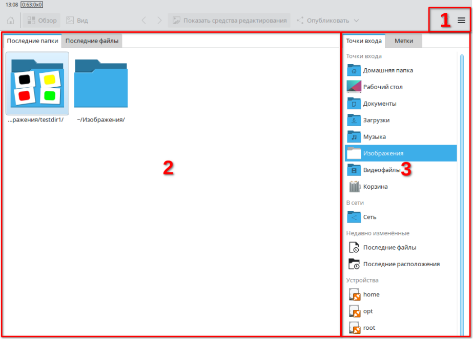 - 2 — панель просмотра. Во вкладке Последние папки отображаются миниатюры последних открытых папок. Во вкладке Последние файлы отображаются миниатюры последних открытых файлов;