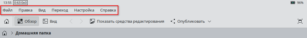 Режим обзора предназначен для навигации по файловой системе, просмотра содержимого папок и выполнения действий с файлами и папками (см. Работа с файлами и папками). Для перехода в режим обзора необходимо на панели инструментов нажать [Обзор].