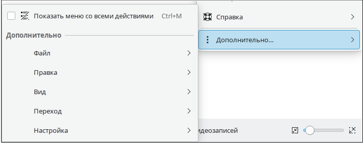 Для настройки отображения строки меню необходимо в меню выбрать Дополнительно и установить/снять флаг Показать меню со всеми действиями.