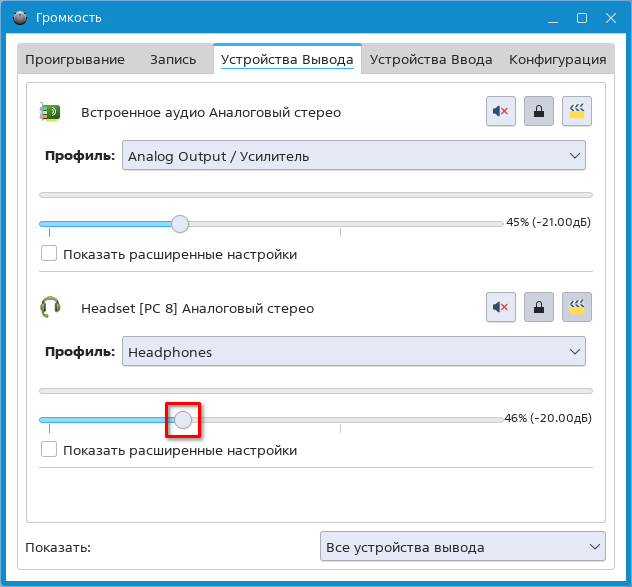 - Аппаратные устройства вывода — будут отображены подключенные физические устройства вывода;