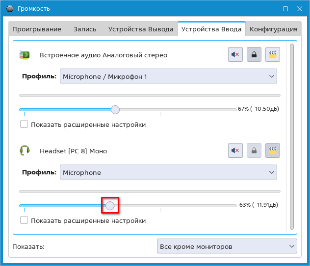 - в секции нужного устройства воспроизведения/записи установить флаг Показать расширенные настройки;