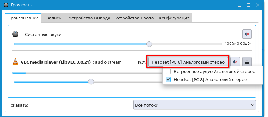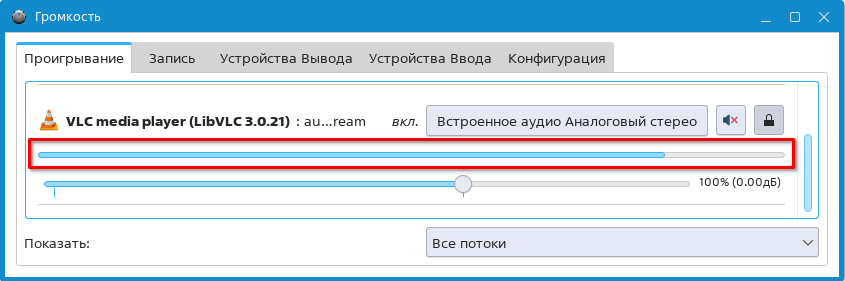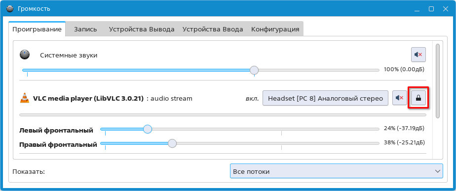 Регулятор громкости устройства управляет уровнем громкости на физическом выходе или входе, например громкостью звука в наушниках. Регулятор громкости звукового потока управляет уровнем громкости в программе, например громкостью медиапроигрывателя VLC. В зависимости от типа устройства или звукового потока можно отрегулировать громкость одного или нескольких каналов. Итоговая громкость складывается из совокупной регулировки громкости устройства воспроизведения/записи звука и звукового потока.