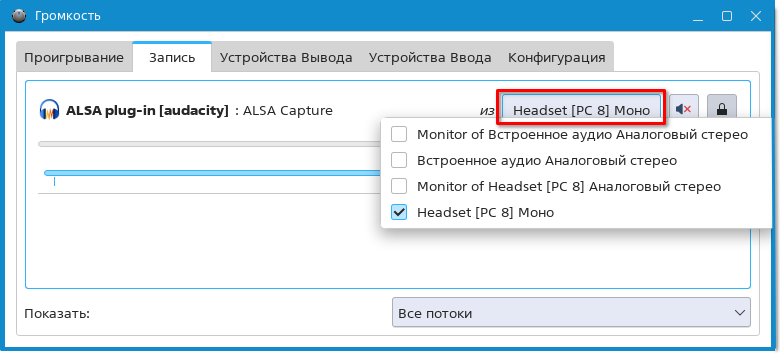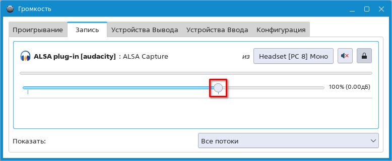 - в программе «Регулятор громкости PulseAudio» перейти во вкладку Запись;
