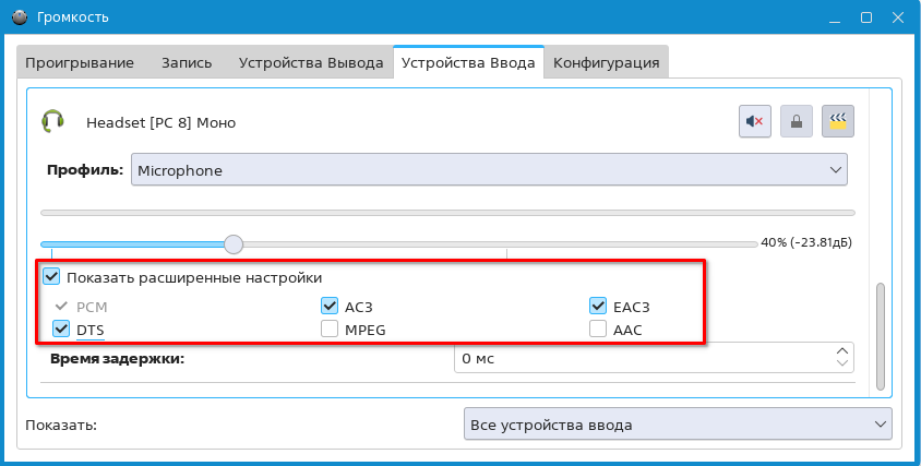 Отдельные модели звуковых устройств могут поддерживать дополнительные форматы воспроизведения или записи звука (например, AC3, DTS, AAC и т.п.). Количество доступных форматов зависит от типа устройства.