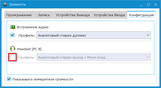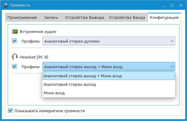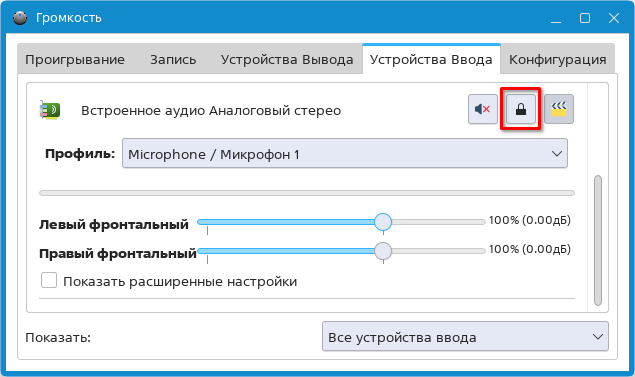 - в секции необходимого устройства нажать [Связать каналы вместе]. Для каждого из доступных каналов будет отображен отдельный ползунок (например, для стереомикрофона — два ползунка);