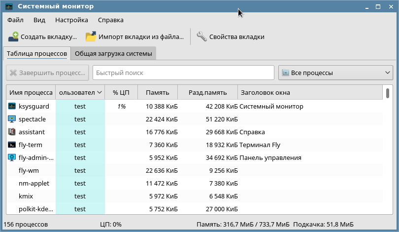 Вид главного окна зависит от флагов, выставленных в пунктах меню, и значений параметров настройки, установленных из пунктов меню. По умолчанию загружаются две вкладки c предустановленными названиями и интервалами обновления: «Таблица процессов» (см. Вкладка «Общая загрузка системы») и «Общая загрузка системы» (см. Вкладка «Таблица процессов»). Остальные вкладки (вкладки с графиками) (см. Вкладки с графиками от датчиков) устанавливаются пользователем для размещения графиков с данными от датчиков.