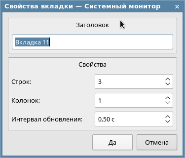 - «Свойства вкладки» - появляется окно для установки структуры активной вкладки. Для вкладка с графиками - это окно «Свойства вкладки». Для предустановленных вкладок «Таблица процессов» (см. Вкладка «Общая загрузка системы») и «Общая загрузка системы» (см. Вкладка «Таблица процессов») появляется окно для установки нового имени вкладки и интервал обновления данных;
