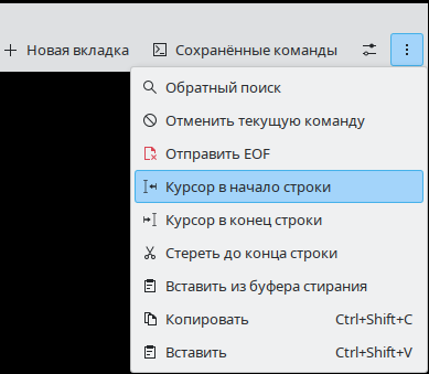 - в начало строки — в меню действий выбрать Курсор в начало строки;