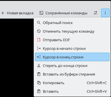 - в конец строки — в меню действий выбрать Курсор в конец строки;