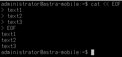 Некоторые команды (например, cat ) поддерживают многострочный ввод, то есть могут принимать в качестве аргумента несколько строк текста. В режиме многострочного ввода при нажатии клавиши <Enter> вместо выполнения команды происходит перенос строки, а для завершения ввода необходимо ввести маркер EOF ( end-of-file) .