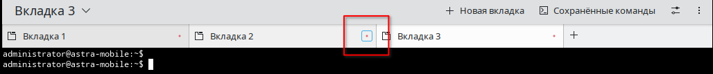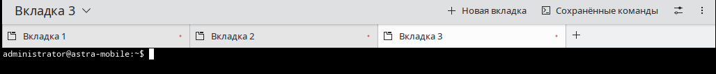 Вкладки позволяют работать в нескольких сеансах терминала одновременно. Чтобы открыть новую вкладку, необходимо нажать [Новая вкладка]. Новая вкладка автоматически становится активной.