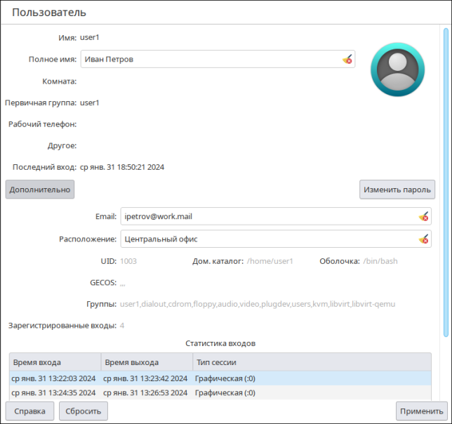 ВНИМАНИЕ! Другие данные учетной записи может редактировать только администратор с использованием модуля Пользователи в разделе Пользователи и группы программы «Параметры системы» (см. справочную страницу «Параметры системы — Пользователи»).