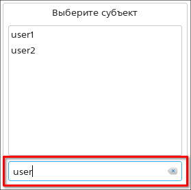 - в поле Выберите субъект выбрать нужный субъект из списка пользователей или групп. При необходимости для поиска субъекта можно воспользоваться полем фильтрации;