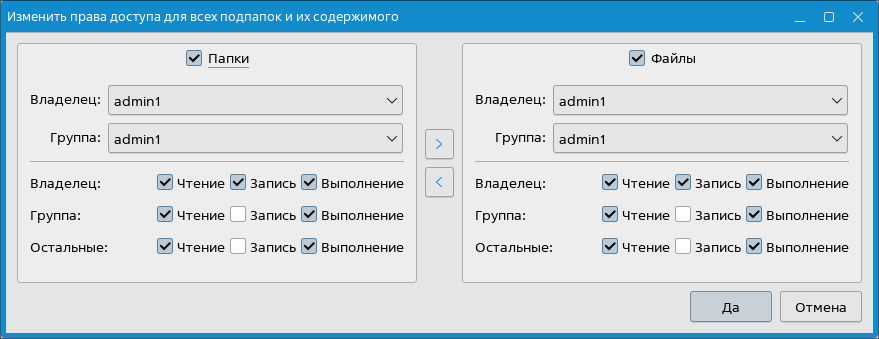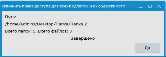 Примечание. Если для вложенных папок и файлов нужны одинаковые настройки, то их можно указать только в одной из секций, а затем скопировать (см. Копирование настроек владельца и прав доступа); - нажать [Да]. Права доступа к папке и к ее содержимому будут изменены. В появившемся окне будет отображен результат операции.