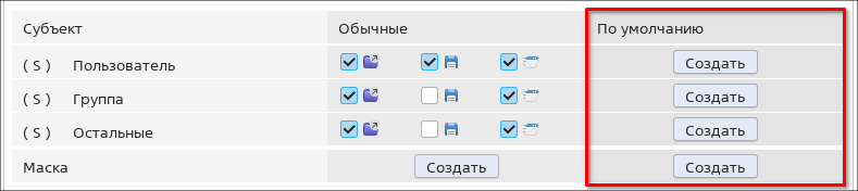 Для папки дополнительно возможно установить права и маску доступа ко вновь добавляемым файлам и папкам. Для этого следует нажать [Создать] в столбце По умолчанию и задать права и/или маску доступа аналогично настройке прав и маски доступа для файла (см. Дискреционные атрибуты файлов).