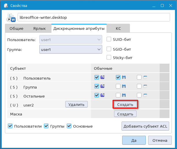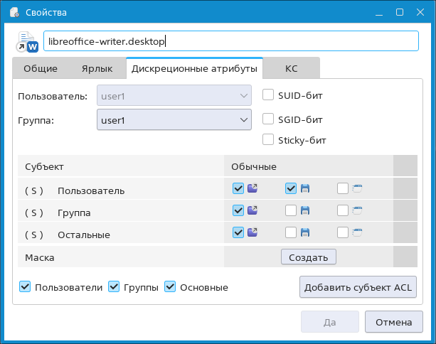 Настроить права доступа на чтение, запись и выполнение файла для субъектов можно, установив соответствующие флаги в столбце Обычные.