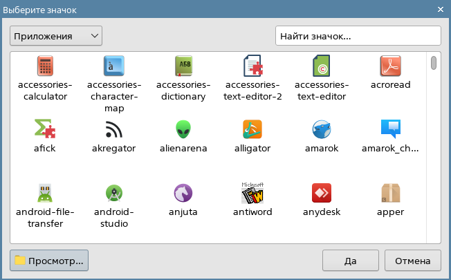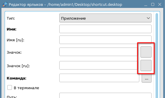 В полях Значок и Значок [ru] отображаются значки ярлыка для английского и русского системных языков соответственно. Выбрать значок возможно либо из системной коллекции, либо в файловой системе.