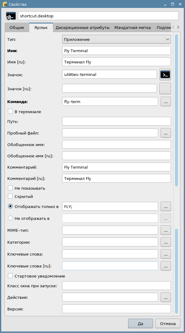 • заполнить остальные поля аналогично полям вкладки Ярлык;