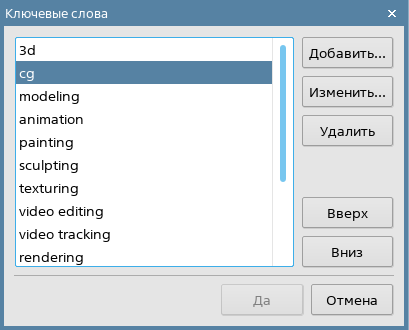 В полях Ключевые слова и Ключевые слова [ru] устанавливаются ключевые слова для поиска и индексирования программы для английского и русского системного языка соответственно.