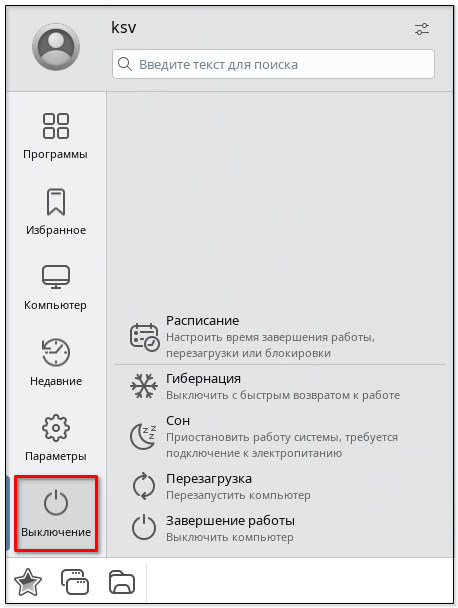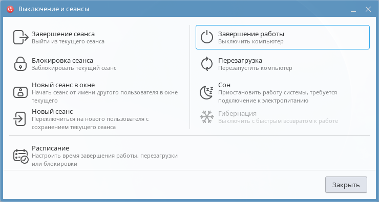 При гибернации все незавершенные сессии, запущенные программы и данные будут сохранены на жестком диске и при следующем включении будут полностью восстановлены (для продолжения работы в сессии будет необходимо ее разблокировать, см. справочную страницу «Графический вход в систему»). При отключении питания все несохраненные данные потеряны не будут. Действие доступно, если есть раздел/файл подкачки.