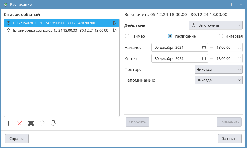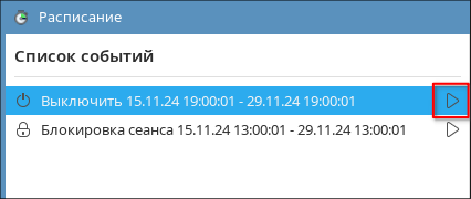 Текущее расписание отображается в поле Список событий. Расписание состоит из событий, каждое из которых выполняет определенное действие в заданное время.