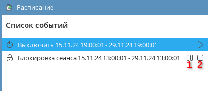 Чтобы приостановить событие, необходимо нажать кнопку паузы (1), а чтобы остановить событие, необходимо нажать кнопку остановки (2). При этом в режиме таймера (см. Добавление и настройка события) остановка события сбросит счетчик времени до начального значения, а приостановка позволит продолжить отсчет времени с того значения, на котором он был приостановлен.