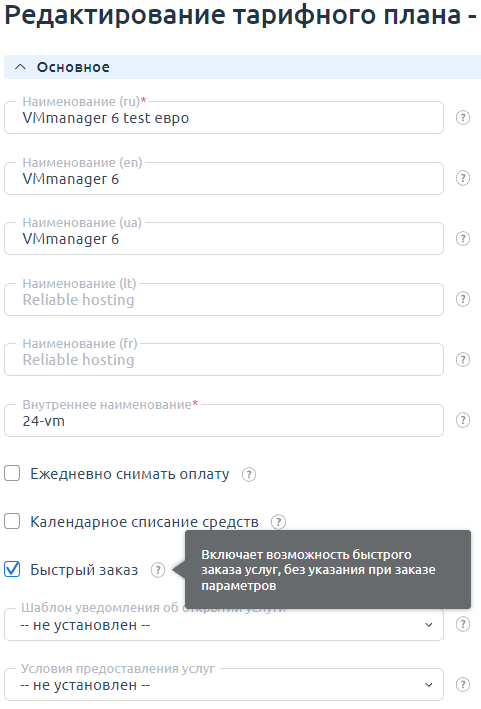 Услуга, которая оформлена через быстрый заказ, будет недоступна для использования, пока пользователь не заполнит все необходимые дополнительные параметры. На Email клиента отправляется письмо с уведомлением о необходимости ввести данные для обработки услуги.