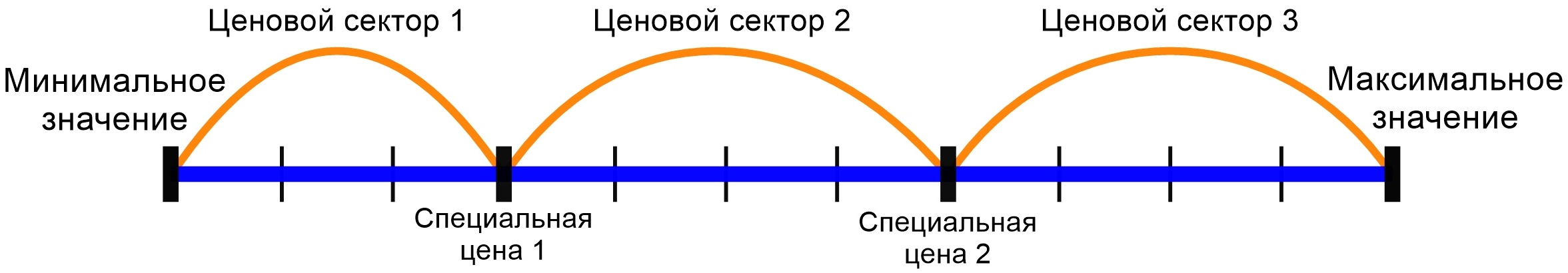 Специальная цена применяется, когда пользователь укажет количество ресурса на точке специальной цены или больше. Таким образом, шкала значений делится на несколько отрезков. В каждом из них цена за один шаг уникальна. В рамках данной статьи этот отрезок будет называться ценовой сектор: