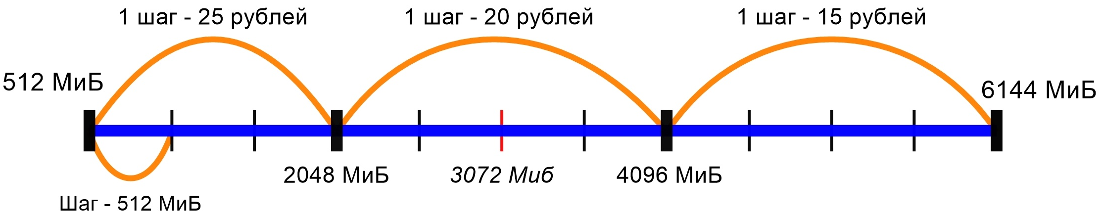 Клиент заказывает 3072 МиБ оперативной памяти и попадает во второй ценовой сектор шкалы значений (1 шаг — 20 рублей). До указанного значения 5 шагов: 3 из них находятся в первом ценовом секторе (1 шаг — 25 рублей), а два во втором (1 шаг — 20 рублей). Стоимость за дополнительный ресурс: (3 * 25) + (2 * 20) = 115 рублей.