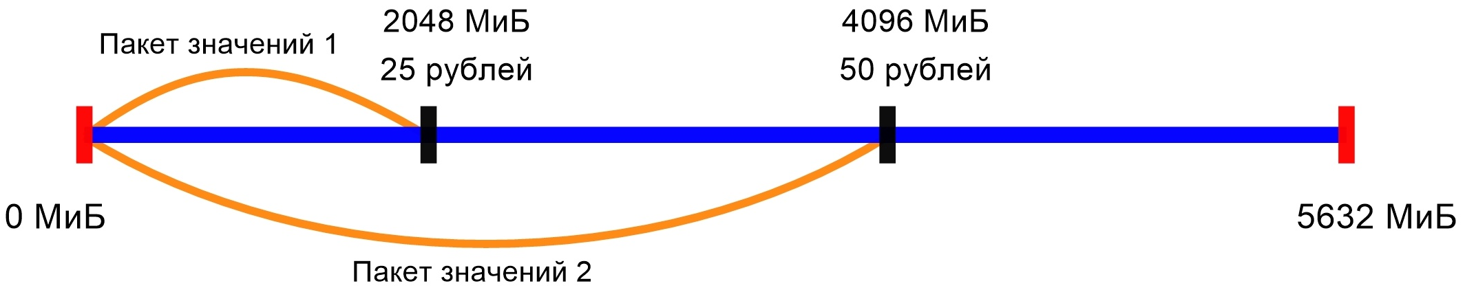 Провайдер настроил две точки специальной цены. При заказе дополнительного ресурса, клиент сможет выбрать только из двух вариантов: дополнительные 2048 МиБ или 4096 МиБ. Заказать 3072 МиБ трафика клиент не может. Клиент выбрал первый пакет значений — 2048 МиБ. К стоимости услуги будет добавлено 25 рублей за дополнительный ресурс. Так как в стоимость тарифа входит 512 МиБ трафика, клиент получит в пользование 2560 МиБ. Если после этого клиент закажет пакет на 4096 МиБ, в итоге он получит 6656 МиБ трафика.