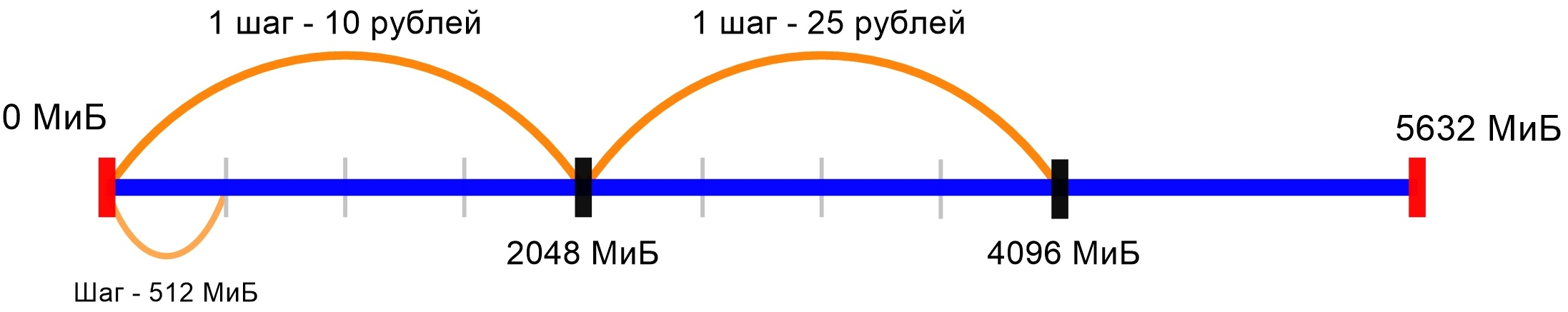 Клиент дополнительно заказывает 2048 МиБ оперативной памяти и попадает в первый ценовой сектор шкалы значений (1 шаг — 10 рублей). От начала шкалы до выбранного варианта (2048 МиБ) четыре шага по 512 МиБ. Стоимость за дополнительный ресурс: 10 * 4 = 40 рублей. Так как в стоимость тарифа входит 512 МиБ оперативной памяти, то в итоге клиент получит в пользование 2560 МиБ.