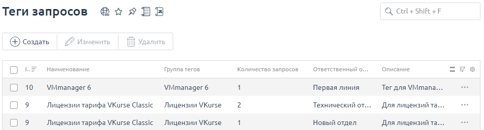 Теги обращений отображаются в общей таблице запросов и по ним доступна фильтрация.