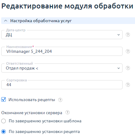 Использовать рецепты — если флаг активен, то при заказе услуги клиент сможет выбрать подходящий рецепт - на странице заказа услуги появится поле "Предустановленное ПО".