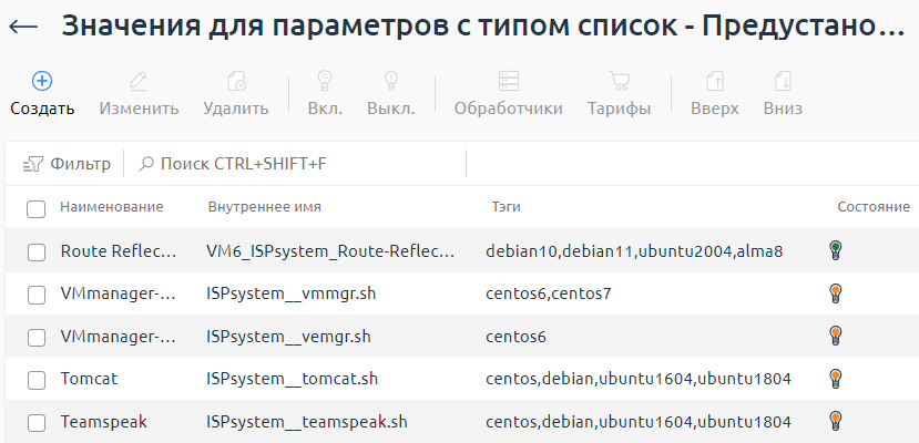 Для каждого значения указываются тэги. Они позволяют настроить взаимосвязь между параметрами "Предустановленное ПО" и "Операционная система", а также с ресурсом "Лицензия на панель управления".