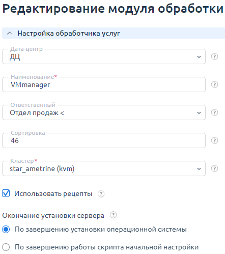 Использование рецептов настраивается при добавлении или редактировании обработчика услуг VMmanager 6.