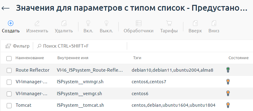 - Перейдите в раздел Продукты → Типы продуктов → Виртуальный сервер → кнопка Параметры → Предустановленное ПО → кнопка Значения.