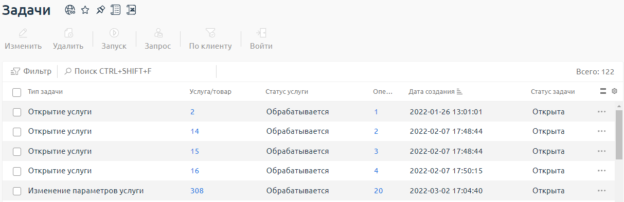 - Тип задачи — тип задачи определяется операцией, которая выполняется с услугой. Если услуга была заказана, то сформируется задача с типом "Открытие услуги".