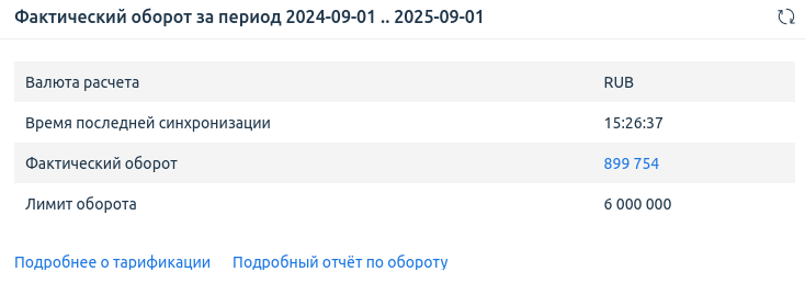 BILLmanager формирует отчёт по обороту в рамках лицензии. Подробнее см. в статье Тариф BILLmanager 6 Hosting&Cloud. Виджет отображает: