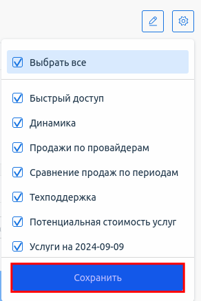 Виджет содержит таблицу с данными о продажах по провайдерам за месяц, год и за всё время. Статистика отображается в валюте, указанной в настройках каждого провайдера.
