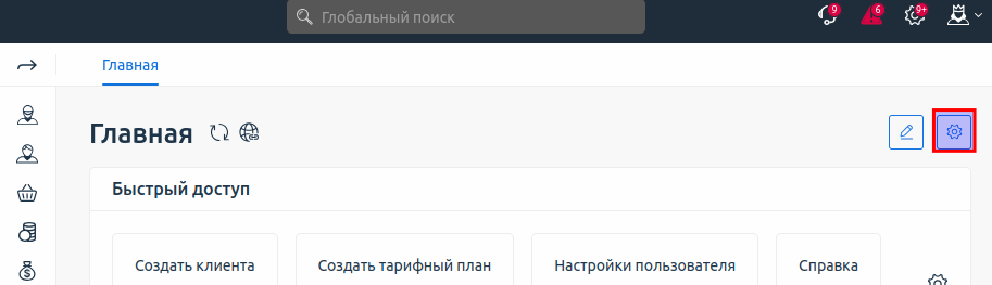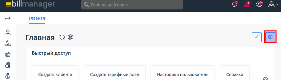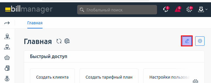 Дашборд BILLmanager — это инструмент для мониторинга платформы. Страница состоит из панели быстрого доступа и виджетов с информацией о: