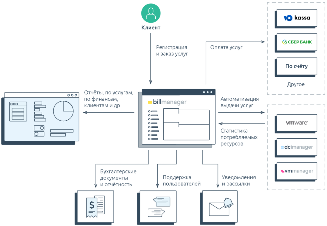 Current: Документация BILLmanager 6 PDF Download PDF Download page Документация BILLmanager 6. Current page Include child pages All pages Документация BILLmanager 6 Что такое BILLmanager?BILLmanager — платформа для хостинговых компаний и облачных провайдеров, которая автоматизирует продажи и работу с клиентами. Продукт BILLmanager является собственной разработкой компании ISPsystem.Возможности платформы:Автоматизация продажи услуг: виртуальных серверов (VPS), виртуальных выделенных серверов (VDS), виртуальных дата-центров (VDC), доменов, SSL-сертификатов, виртуальных хостингов;Приём платежей: интеграция с Т-Банк, Альфа-Банк, Сбербанк и еще более 20 различных сервисов;Интеграция с АТОЛ онлайн и Модулькассой;Документооборот: автоматизированное выставление счетов за услуги, интеграция с ЭДО Диадок;Зачисление банковских платежей: интеграция с 1C;Автоматизация приёма оплат, реккурентные платежи;Маркетинговые инструменты (сегментирование, рассылки, акции и пр.) и CRM;Возможность работы с несколькими проектами одновременно, а также White label;Встроенная система поддержки;Встроенные BI-инструменты для построения аналитических отчётов.Открытый API позволяет BILLmanager интегрироваться с любыми сторонними программными продуктами, включая системы мониторинга для оборудования:Solarwinds;Zabbix;HP SM (КСУИТ). Начало работы с платформойВ таблице приведены ссылки на статьи документации по работе и настройке BILLmanager.Установка платформыНастройка услугНастройка тарифаТребования к серверуЛицензированиеПроцесс установкиМастер начальной настройкиТипы продуктовСодержание типа продуктаПараметры типа продуктаСоздание, настройка, архивация тарифаСодержание тарифного планаОграничение доступа к тарифамПолезные ссылкиРесурсы компанииДля разработчиковБлог ISPsystemChangelog RoadmapСтруктура базы данныхВзаимодействие через APIУправление услугами по APIAPI Swagger BILLmanagerСоздание модулей ×